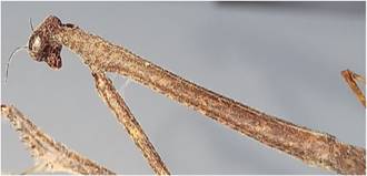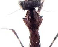 2 Rostro con escudo frontal a lo sumo tres veces más ancho que alto (Figura 13). Lóbulos apicales internos de las coxas anteriores contiguos. Especies de tamaño grande, más de 10 cm ........ Macromantis