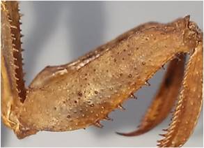 3 Cabeza sin proyecciones, vértice liso o granular, pronoto liso, fémures anteriores con 6 espinas externas (Figura 17), fémures medios y posteriores sin lóbulos. Cercos cónicos con el último segmento achatado ........ Acanthops