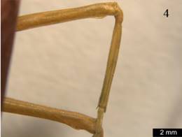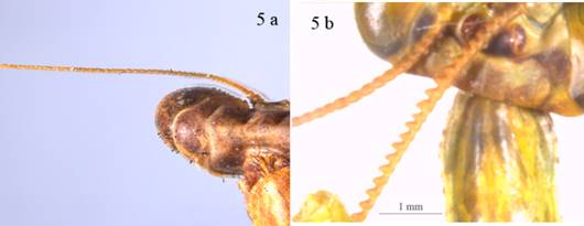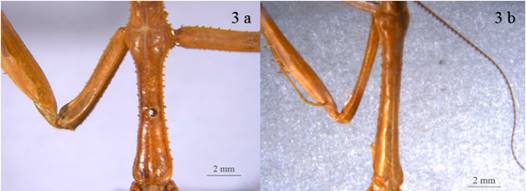 2’ Coxas anteriores no alcanzan la base del prosterno (Figura 3b), fémures de las patas medias y posteriores sin lóbulos preapicales (Figura 2a), antenas aserradas en los machos (Figura 5b) ........ Parastagmatoptera