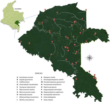 La Amazonia es una vasta región selvática compartida por varios países suramericanos, es considerada una de las más biodiversas del mundo (Antonelli et al., 2018), y los mántidos participan al igual de esa riqueza. Así por ejemplo en una zona del centro oriente peruano, en la región de Huanuco, Schwartz et al. (2020) realizaron un inventario de los mantodea presentes allí, encontrando 430 ejemplares pertenecientes a 44 especies de 28 géneros, y logrando entre ellas, nuevos registros para el área en cuestión. Esto no es de sorprender ya que faltan muchas regiones amazónicas en ser muestreadas, y se requieren acciones urgentes dentro de proyectos prioritarios ante la avanzada inevitable de la deforestación y el cambio climático, factores que impiden seriamente conocer las mantis habitantes de la Amazonia en general (Anteparra et al., 2013; Lanna et al., 2023). Ahora bien, en dicho contexto, y desde los trabajos pioneros de Apolinar (1924, 1937), la fauna colombiana de mantodea viene siendo estudiada, pero con pocos aportes en cuanto al conocimiento de las especies amazónicas procedentes del bosque húmedo tropical de tierras bajas (Salazar, 2001, 2003, 2006, 2007; González et al., 2011; Gamboa y Salazar, 2021). Por otro lado, Salazar (2002) en su lista de mantodea conocidas para Colombia, cita los departamentos de Amazonas, Guaviare y Putumayo para unas pocas especies indicadas por él.