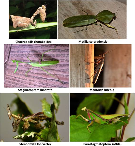 El material de Mantodea registrado en el presente estudio, lo componen 50 ejemplares de 23 especies, pertenecientes a 19 géneros que listan seguidamente en orden alfabético: