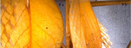 Figura 9 A. área costal de las tegminas de las hembras con más venas transversales que longitudinales; B. área costal de las tegminas de las hembras con más venas longitudinales que transversales.