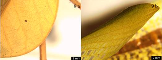5 Área costal más dilatada que al área discoidal (Figura 8a), área costal de las tegminas de las hembras con más venas transversales que longitudinales (Figura 9a) ........ Pseudoxyops