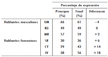 La Tabla 2 presenta las tendencias generales de aspiración de cada hablante. Es evidente que mientras la /s/ aspirada es un rasgo presente en el habla de todos los entrevistados, los hablantes masculinos aspiran con más frecuencia, mientras las hablantes femeninas prefieren la variante estándar [s]. Se encontró una diferencia significativa para el porcentaje de aspiración total según la variable sexo, F (1, 4) = 9.462 (p < 0,05). Los siguientes ejemplos reflejan algunas instancias de [h] y [s] en el habla de cada informante.