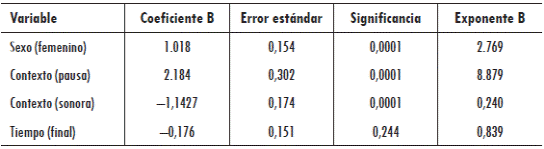 Como se aprecia en la tabla, tanto el sexo del hablante como el contexto fonológico son variables significativas en el modelo de regresión. Es 2.769 veces más probable que una mujer produzca la /s/ sibilante que un hombre; es decir, es más probable que una mujer adopte la variante estándar en cualquier contexto. Además, es 8.879 veces más probable que la /s/ se realice como sibilante ante una pausa que ante una consonante sorda. Por el contrario, una consonante sonora no favorece la variante estándar, como indica el coeficiente con un valor negativo. En este caso, es más probable que se aspire la /s/ cuando precede una consonante sonora.