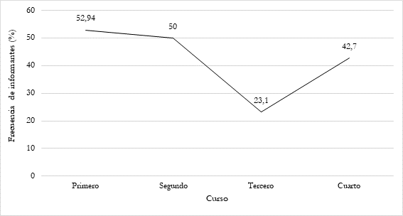 Los porcentajes que se observan en la figura 1 indican que los estudiantes de los dos primeros cursos, y quizás también los de tercero, perciben de manera más destacada un cambio de estilo entre los estudios previos y la universidad. Estas divergencias entre cursos podrían estar relacionadas con el reciente ingreso en la universidad, especialmente en los dos primeros cursos; sin embargo, en el caso de tercero, la causa podría orientarse más hacia el efecto que pudiera tener la especialización del grado, en ese curso, en los estudiantes y en las tareas que deben afrontar en adelante. La inserción en una cultura disciplinar concreta resulta más evidente a medida que se centra el foco de atención de las programaciones en áreas más concretas.