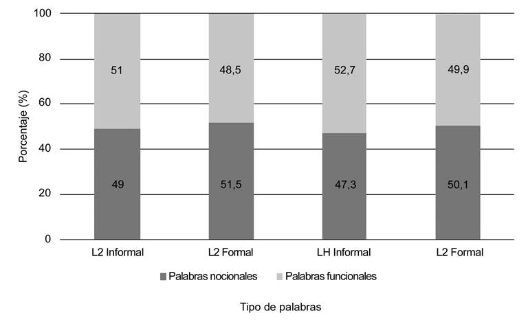 En la Figura 2 se muestran los porcentajes de palabras léxicas y palabras derivadas. Se puede notar que los participantes de lh presentan una mayor diferenciación entre el registro formal y el registro informal, en comparación con el grupo de L2.