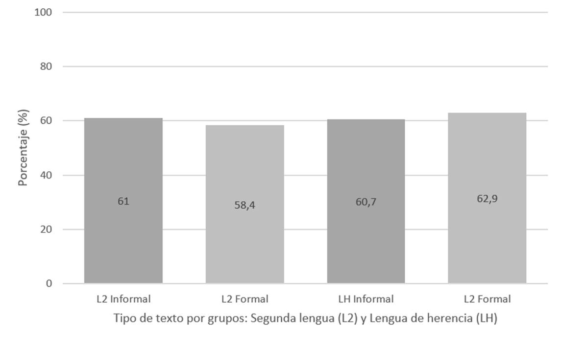 Por otro lado, en el grupo de lh la dil aumentó un 2 %, según lo esperado. En ambos grupos, las diferencias porcentuales entre los textos formales e informales no fueron copiosas.