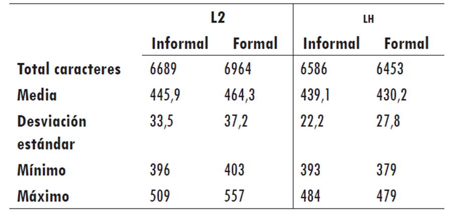 Dado que los hablantes de lh han tenido una exposición de la lengua principalmente en contextos informales -como en el hogar o en otros ambientes familiares (Valdés, 2001, p. 2)-, se esperaba que no les fuera problemático desarrollar una escritura informal. Por otro lado, el desarrollo de un discurso formal podría representarles un mayor esfuerzo, debido a una menor exposición a la lengua en contextos formales o académicos. En cambio, se previó lo contrario para los estudiantes de L2: que poseían más estrategias para desarrollar una escritura formal, debido a que han estado expuestos a un español más prescriptivo en un contexto escolar, y, en tales condiciones, que no poseyeran suficientes estrategias para elaborar un discurso informal, suponiendo que no han tenido adecuada exposición a contextos informales.