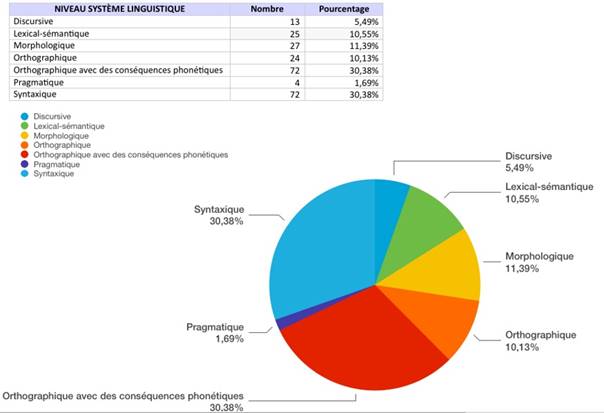 Du point de vue du niveau du système linguistique, les erreurs orthographiques avec des conséquences phonétiques (30,38 %) et les erreurs syntaxiques (30,38 %) constituent plus de la moitié du total des erreurs détectées (62,45 %) (Figure 1).