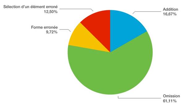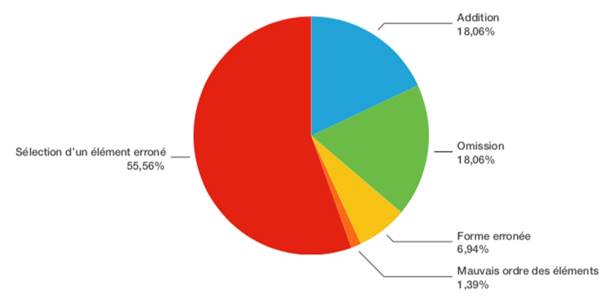 Au niveau syntaxique, plus de la moitié des erreurs sont produites par la sélection d’un élément erroné (55,56 %). Suivraient par fréquence l’addition et l’omission, à pourcentage égal (18,06 %) (Figure 4).