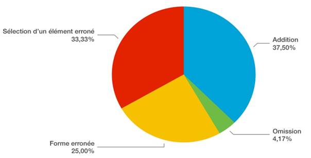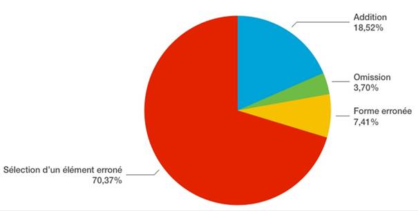 Au niveau morphologique, plus de la moitié des erreurs sont produites par la sélection d’un élément erroné (70,37 %). La deuxième raison pour ce type d’erreurs serait l’addition (18,52 %) (Figure 5).