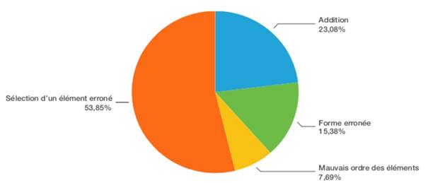 Au niveau discursif, plus de la moitié des erreurs se trouvent dans la sélection d’un élément erroné (53,85 %), et presque un quart des erreurs restantes sont provoquées par l’addition d’un élément non pertinent (23,08 %) (Figure 7).