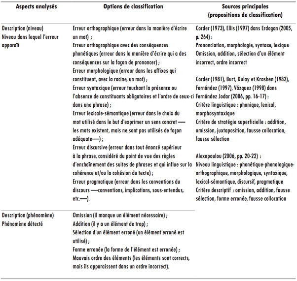 Afin de bonifier notre première proposition de classification, lors de l’analyse qualitative, nous considérons également quelques-uns de nos résultats en les comparant avec la classification d’erreurs d’Hamel et de Milicevic (2007), qui s’insère dans la théorie linguistique Sens-Texte et dont le but est notamment lexicographique-pédagogique. Les trois groupes principaux d’erreurs considérés dans leur recherche sont les suivants :