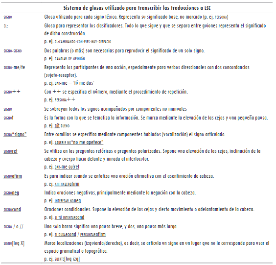 Por otro lado, queremos advertir que la compilación de vídeos es ilustrativa y no presenta la uniformidad y exhaustividad requeridas para un estudio de corpus. El procedimiento de investigación fue: examinar cada uno de los vídeos, transcribir a glosas (véase Anexo) las traducciones en LSE mediante una adaptación del sistema de glosas propuesto por Herrero (2009) y, por último, clasificar cada traducción según las técnicas utilizadas.