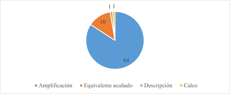 En la Figura 1 podemos ver que, en las 76 traducciones, el alumnado aplicó la técnica de amplificación en 64 ocasiones (84,2 %). Para el resto utilizaron la técnica de equivalente acuñado, 10 veces (13,1 %), y solo 1 vez la de descripción (1,3 %) y la de calco (1,3 %). Las 14 técnicas restantes propuestas por Hurtado (2001) no fueron empleadas en este estudio.