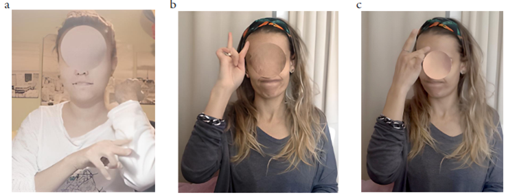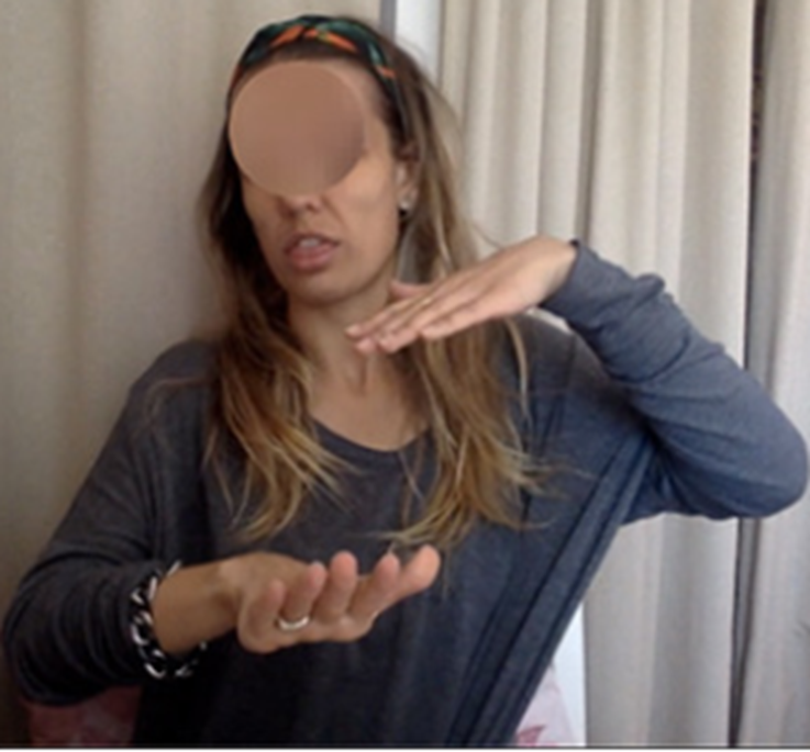 Incluimos a continuación una serie de fotogramas de los equivalentes acuñados por uso lingüístico elegidos por el alumnado (véase Figura 2). El resto de los ejemplos que aparecen en la Tabla 3 corresponden a equivalentes acuñados mediante diccionarios de LSE. En concreto, todos estos términos pueden consultarse en el dilse: Diccionario de la lengua de signos española (Fundación CNSE, 2019). Por este motivo, ya que es un recurso accesible a través de Internet y cuenta con fotografías y vídeos que aclaran el movimiento de los diferentes signos, hemos optado por no incluir más capturas de las grabaciones del alumnado.