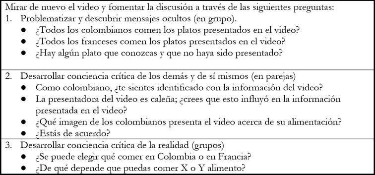 Una de las actividades parte de un video sobre la alimentación en Colombia y en Francia (La prof Yareth, 2020), a partir del cual propusieron una serie de preguntas encaminadas a deconstruir estereotipos sobre las personas de los países en mención, como lo vemos en la Figura 1. En esta propuesta, vemos que los docentes integraron tres niveles de reflexión que se discutieron en el curso. De esta manera, buscaron hacer visible la heterogeneidad en aspectos de la cultura como la comida, problemáticas asociadas a esta, e invitaron a los estudiantes a hacer conexiones entre lo local y lo global. Este último aspecto también lo trataron de integrar a sus planeaciones los demás equipos. En palabras de una de las profesoras: “la relación entre lo global y lo local es interesante e importante. Lo intercultural no puede ser únicamente hablar sobre sus propios pueblos sin mirarse con respecto a otros” (Mariana, sesión 10).