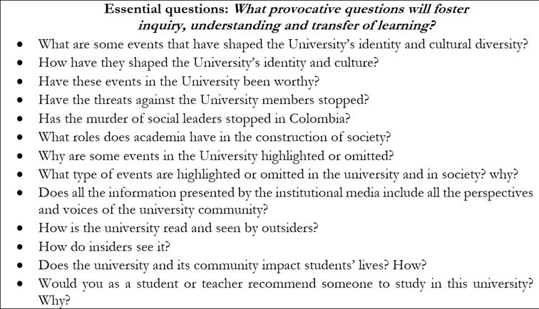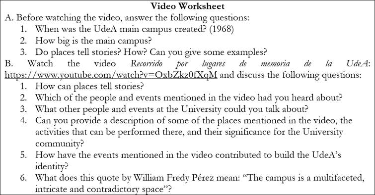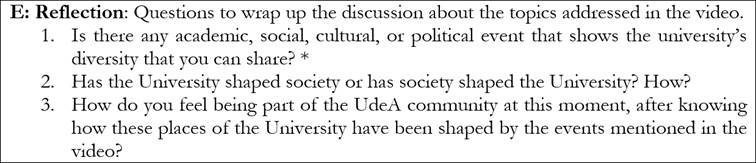 Otro ejemplo de propuestas que permitieran la reflexión crítica sobre asuntos interculturales en la clase de inglés se dio en la planeación de una unidad para el PIFLE-I, cuyo tema principal eran los lugares de la Universidad de Antioquia. En este trabajo, se observó una adaptación de la unidad original, incluyendo los objetivos y los materiales. Este equipo privilegió el descubrimiento de historias alrededor de los lugares de la Universidad y de la relación de los estudiantes con ellas. En la Figura 2, se observan algunas de las preguntas propuestas para explorar durante la unidad. Una de las actividades propuestas consiste en ver un video que presenta un recorrido por los lugares de memoria de la institución y su significado para la comunidad universitaria (Ude@, s. f.). Como parte de la secuencia de trabajo, el equipo propone las preguntas enunciadas en la Figura 3.