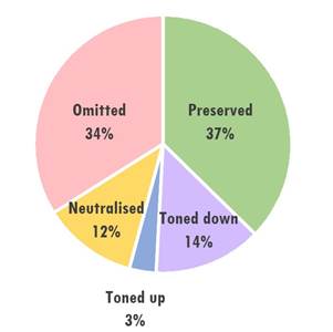 The following quantitative analysis establishes the frequency with which the OL of foul language was rendered in the TL subtitles of the first three episodes of El Vecino and to what extent it happened. All the analysed instances are illustrated in the form of two pie charts (Figures 1 and 2). It is worth pointing out that humorous swearing will not be commented upon as no examples were spotted in the corpus examined.