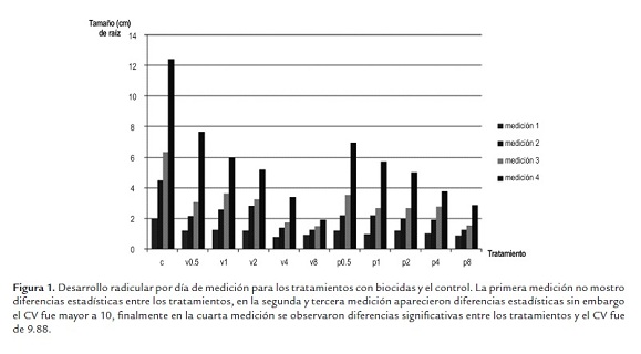 El coeficiente de variación (CV) para la primera medición resulto superior a 10, por consiguiente el análisis de varianza y comparación de medias no eran estadísticamente aceptables. Conforme se hicieron la segunda y tercera medición se obtuvieron valores de CV (coeficiente de variación) cercanos a 10, es decir, en cada medición siguiente el CV fue disminuyendo, mostrando diferencias significativas entre los tratamientos y agrupamientos estadísticamente aceptables (figura 1). El análisis de varianza del ensayo para la última medición con 10 grados de libertad, con 5 repeticiones por tratamiento, con 0 unidades perdidas y un alfa= 0.01 para el análisis de agrupamiento mostró diferencias significativas entre los tratamientos y un CV de 9.88, siendo estadísticamente aceptable el experimento realizado. La comparación de medias mediante Duncan (alfa= 0.01) muestra cinco grupos distintos (A: control; B: V0.5 y P0.5; C: V1, V2, P1 y P2; D: V4, P4 y P8; E: V8), el tratamiento V8 presenta menor tamaño de raíz, 1.96 cm, los tratamientos V1, V2, P1, P2 no muestran diferencias significativas en el tamaño de raíz (tamaño promedio 5.5 +/- 0.4 cm) y el control el mayor tamaño, 12.42 cm. Mediante Dunnett´s (alfa= 0.01) se observó que el control es distinto a los demás tratamientos, teniendo una diferencia menor entre medias con los tratamientos V0.5 (4.7cm) y P0.5 (5.4cm), y mayor diferencia de medias con los tratamientos V8 (10.5cm) y P8 (9.5cm), sin embargo todos los tratamientos son estadísticamente muy diferentes al control.