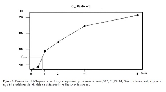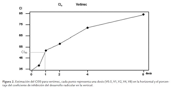 Con los valores de inhibición se construyo una gráfica de concentración versus porcentaje de inhibición y se calculó el CI50 (concentración que produce el 50 % de reducción en la longitud de raíz). Diseño experimental utilizado fue el DCA (diseño completamente aleatorio) adaptado para el test Allium (Fiskesjo, 1985). Para analizar los datos obtenidos se utilizó el paquete estadístico SAS 9.2 que permitió hacer el análisis de varianza y pruebas de comparación de medias como Duncan y Dunnett's.