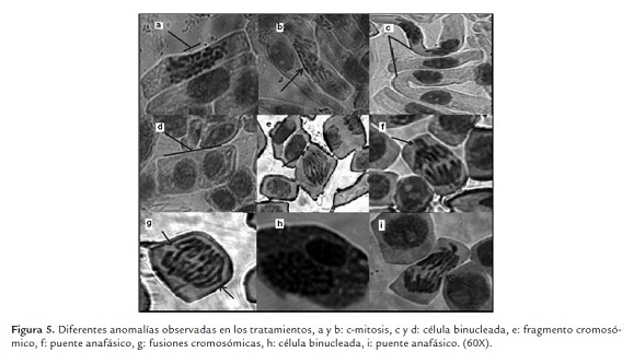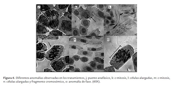 Se observó la presencia de anomalías en el ciclo celular producido por la toxicidad de los biocidas, observándose distintos tipos de aberraciones o anomalías cromosómicas dentro de las distintas etapas del ciclo celular. En la figura 5 y 6 se observan las anomalías más comunes encontradas, en el tratamiento V0.5 se observa un puente anafásico (i), en el tratamiento P0.5 una célula binucleada con un núcleo en interfase y otro en profase (h) y una c-mitosis (m), en el tratamiento V1 una c-mitosis (b) y un puente anafásico (j), en el tratamiento P1 una C-mitosis (a), células alargadas y un fragmento cromosómico aberrante (n) y una anomalía en la anafase por el huso mitótico desorganizado (o), en el tratamiento V2 una célula binucleada y una célula en telofase posiblemente binucleada (c) y varias fusiones cromosómicas que podrían ser múltiples puentes anafásicos (g), en el tratamiento P2 una célula binucleada (d) y una c-mitosis (k), en el tratamiento V4 un puente anafásico (f), en el tratamiento P4 un fragmento cromosómico aberrante candidato a formar micronúcleo (e), y en el tratamiento P8 células alargadas y presencia de fantasmas celulares (l). Para los tratamientos V8 y P8 muchas células estaban fragmentadas y eran de mayor tamaño, difícilmente se observo una anomalía. Según lo observado las anomalías más frecuentes eran la C-mitosis y anomalías en anafase, adicionalmente cambios en la forma celular.