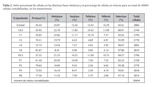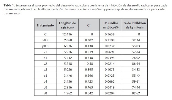 Contabilizado el número de células en mitosis y el número de células en total, se hallo el IM (índice mitótico), teniendo como índice mayor al tratamiento control, 16.39%, y menores índices para los tratamientos P8 y V8, 2.8% y 2.1% respectivamente (tabla 1). Se calculó también el coeficiente de inhibición mitótica para cada tipo de biocida y resultó que los índices para los tratamientos P1 y V1 correspondientes a la dosis normal de uso, representan el 55 % de inhibición mitótica (tabla 1 y 2), esto muy relacionado al coeficiente de inhibición media para el tamaño de raíz.