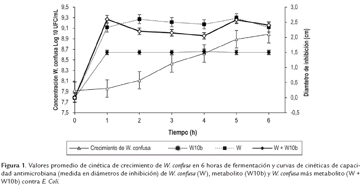 En la figura 1, se muestran las curvas de las cinéticas de capacidad antimicrobiana de W. confusa y sus metabolitos frente a E. coli. Según los resultados estadísticos se encontraron diferencias significativas (p<0.05) entre los tratamientos, y el efecto combinado entre los tratamientos y el tiempo de evaluación.