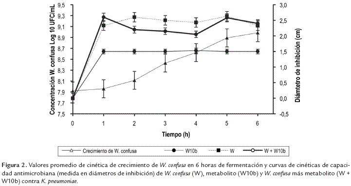 En las figuras 1 y 2 se observa la curva semi logarítmica del crecimiento de W. confusa y la actividad antimicrobiana (diámetros de inhibición) de cada uno de los tratamientos. Para ambos casos se observa que la acción antimicrobiana de la bacteria, está asociada a su crecimiento.