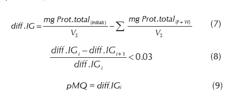 Practical Maximum Quantity (pMQ) is defined as the protein maximum quantity that has immobilized in the practice when a study charge is made (Equations 7 and 8). When increments on protein load do not represent an increase of the differential immobilisation grade (diff.IG) (del Monte et al., 2002), but it remains stable within a 3% of variability, that diff.IG is considered the pMQ. diff.IG is determined taking into account the initial and final protein concentration of each immobilisation process, it is expressed in mg of protein immobilised per gram of support [mg/g] (equation 9).
