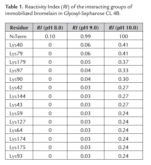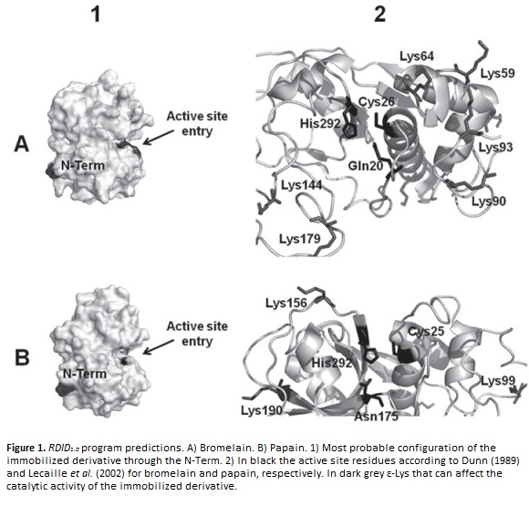 To determine the optimum immobilization pH and to predict the most probable configuration of the immobilized derivative was calculated the parameter RI (tables 1 and 2). For bromelain and papain in the three analyzed pH conditions, the highest probability of reaction with the activated support corresponds to the N-Term residue (N-Term). The configuration acquired by the immobilized derivative via the N-Term is catalytically competent in both cases, because the active site is orientated towards the pore´s lumen (figure 1-A1 and figure 1-B1).