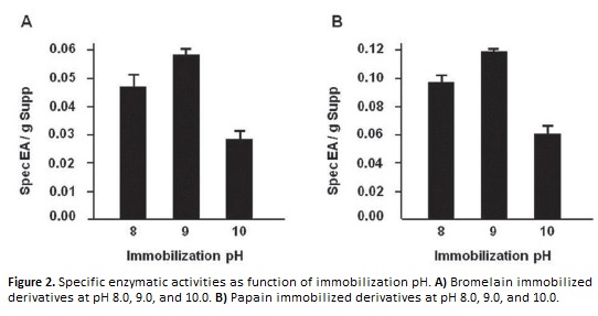 Optimization of immobilization conditions becomes as an important step to generate more robust and efficient biocatalyst. The employment of enzymes in affinity chromatography and bioconversion processes often encounters the problem of inactivation of enzyme. Bromelain and papain immobilized derivatives showed desired characteristics for industrial biocatalysis, such as: elevate pH stability retaining 95% and 100% residual activity at pH 7.0 and 8.0, for bromelain and papain, respectively; high thermal stability at 30 °C retaining 90% residual activity for both immobilized enzymes; a catalytic configuration bonded by immobilization at optimal pH; and the ligand load achieve ensure the minimization of diffusional restrictions.