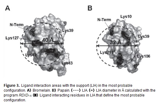 Was calculated the parameter SIR for each enzyme, considering a maximum activation grade of the support (71.42 µmol CHO/g Supp) (Guisán, 1988). The results for bromelain (SIR =21) and papain (SIR=14) indicate the existence of several carbonyl groups in the interaction area enzyme-support (10% of the ligand area). Theoretically can be formed 21 and 14 support-ligand bonds for t bromelain and papain, respectively. The results of LIGRe predictions were 15 reactive groups in (N-Term and 14 ε-Lys) for bromelain (table 1) and 8 groups (N-Term and 7 ε-Lys) for papain (table 2). This availableness of enzyme interacting groups in the surface conduces to the obtainment of multi-bounded immobilized derivatives. However, it is necessary to point out that these groups may not be localized inside the same interaction area (figure 3), defined in this case by the most probable configuration (figure 1-A1 and 1-B1), in both proteins via the N-Term. This result reduce from 15 to 5 (N-Term, Lys39, Lys42, Lys43, Lys127) for bromelain and from 8 to 5 (N-Term, Lys10, Lys39, Lys106, Lys211) for the papain the number of probable bonds with the support (figure 3).
