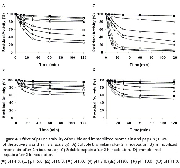 The stability of papain was dramatically enhanced after immobilization in Glyoxyl-Sepharose CL 4B support. Soluble papain showed residual activity up to 80% only at pH 7-8, stability decrease considerably at acid and alkaline pH (figure 4C). These results are consistent with the report of Liu and Hanzlik (1993), which demonstrate that papain showed highest stability at physiological pH values. Immobilized papain was extremely stable, retaining up to 50% residual activity after 2 h at pH 4-11 (figure 4D). Better residual activities were achieved at pH 7-9 (up to 90% residual activity in all cases). However, the highest stability was raised at pH 8.0, 100% residual activity after 2 h incubation.