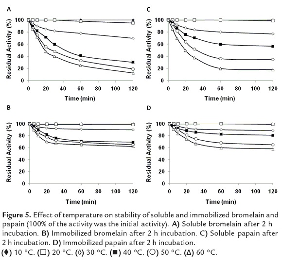 The thermal stability of soluble papain was very high, retaining 80% and 60% residual activity after preservation for 2 h at 30 °C and 40 °C, respectively. Further increase of temperature caused stability loss to 20% residual activity. On the contrary, immobilized papain showed high thermal stability retaining 90% residual activity after 2 h incubation at 30 °C, and 60% residual activity at 60 °C.