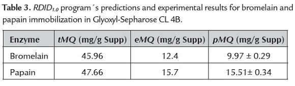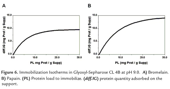 A critical requirement for any material to be used as a support for protein immobilization is the necessity to have a large surface area (small particle size or highly porous materials). The protein binding support capacity will depend on the pore diameter (PD) and tortuosity of the support, and also the protein size. This last one explains the highest adsorption capacity of papain showed by Glyoxyl-Sepharose CL 4B. Papain is 12Å smaller than bromelain and consequently; the binding capacity of the employed support is higher for papain (0.99µmol/g Supp and 0.6µmol/g Supp for papain and bromelain, respectively).