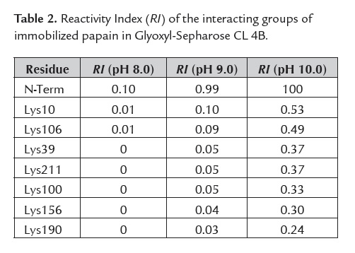 For both enzymes the possibility of multipoint-covalent attachment with the support is viable (5 attachments), but there is differences in the residue´s RI involved in the union to the support for each enzyme. The presence, in the interacting area support-enzyme of papain, of two residues (ε-Lys10, ε-Lys106) with a RI ~ 0.10, increase the velocity of multipoint-covalent attachment and the efficiency on the stabilizing effect (figure 3).