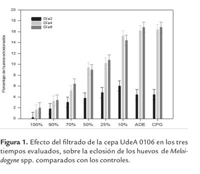Los resultados anteriores, indican que la cepa UdeA0106, podría estar produciendo ciertas sustancias que inhibirían la eclosión de los huevos del complejo Meloidogyne spp., aspecto que debe ser estudiado en posteriores investigaciones.