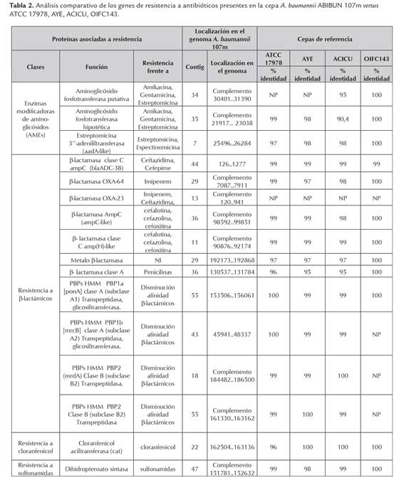 En el genoma de A. baumannii ABIBUN 107m se localizaron genes asociados con el perfil de resistencia que presenta: enzimas modificadoras de aminoglicósidos (aphA-like, aadA-like); β-lactamasas (blaADC-38, blaOXA-64, blaOXA-23, blaampC-like, blaamp(H)-like), β-lactamasa clase A ; metalo β-lactamasa (MBL) dependiente de Zn; secuencia de inserción tipo ISAba1; mutaciones en las proteínas GyrA (serina por leucina) en la posición 82 y la misma mutación en la posición 84 en la proteína parC codificadas por los genes de la DNA girasa y topoisomerasa IV subunidad A (gyrA y parC); la resistencia a cloranfenicol se podría explicar, parcialmente, por la presencia del gen cat que codifica para la cloranfenicol aciltransferasa y la resistencia a sulfonamidas por el gen sul-1 que codifica para una dehidropteroato sintasa. Adicionalmente se identificaron 4 PBPs de elevada masa molecular que coadyuvarían a disminuir la afinidad de los antibióticos β-lactámicos con su blanco. Se localizaron, en A. baumannii ABIBUN 107m, genes asociados a cinco sistemas de eflujo (RND, MATE, MSF, ATP, SMR). Particularmente el sistema RND, presenta un amplio rango de sustratos. AdeABC y AdeIJK expulsan antibióticos y AdeIJK es intrínseco a esta especie y es el responsable de la resistencia natural que presenta Acinetobacter. La presencia de estos sistemas ayudarían a la disminución de la concentración de los antibióticos especialmente de los β-lactámicos pero también de fluoroquinolonas, cloranfenicol, colistina y tetraciclinas.
