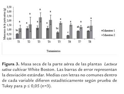 Masa seca de la plantas. En el primer mes de muestreo, en la variable masa aérea los tratamientos T3 y T4 presentaron un aumento en la biomasa aérea respecto al testigo químico; sin embargo, no fue estadísticamente significativo (p≤ 0.05) (figura 2) En el segundo mes de muestreo los tratamientos T3 y T4 presentaron un aumento significativo (p≤ 0.05) de 105 % y 102 % respecto a T2 (figura 3).