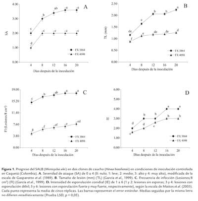 M. ulei generó síntomas cloróticos (SA, TL, FI) del SALB en ambos clones de caucho (FX 3864 y FX 4098) (tabla 4), los cuales se observaron a los 4 días después de la inoculación (período de incubación) (figuras 1A-C). Los signos de la enfermedad (IE= 3) se manifestaron a los 8 días en el clon FX 3864 y a los 12 días en el clon FX 4098 (período de latencia) (figura 1D). El clon FX 3864 presentó la mayor susceptibilidad a M. ulei con las mayores notas de severidad de la enfermedad (tabla 4) y una esporulación alta, heterogénea sobre la cara inferior de los foliolos (IE= 4) registrada a partir del día 16 después de la inoculación (figura 1D). Luego del día 12 después de la inoculación, en general se observaron a través del tiempo mínimas diferencias en los valores medios de las cuatro variables analizadas (tabla 4 y figuras 1A-D).