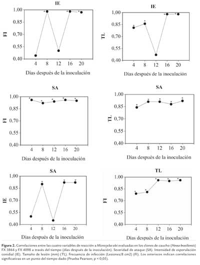 Las bajas correlaciones observadas en éste estudio en el día 12 entre IE y las variables SA y TL, difieren de Sterling et al. (2010b) quienes encontraron para el mismo período de evaluación una importante correlación entre la esporulación y la severidad del SALB (r = 0,76). Sterling et al. (2011) en condiciones de campo también reportaron una alta correlación entre el ataque y la esporulación (r = 0,87) de M. ulei en genotipos élite regionales de caucho en la Amazonia colombiana. Con excepción de las correlaciones observadas entre IE y SA en los días 4 y 12 (figura 2), en los demás días del progreso del SALB, la severidad de ataque y la esporulación conidial de M. ulei se correlacionaron positivamente (r ≥ 0,90), similar a los reportes de los autores antes mencionados.