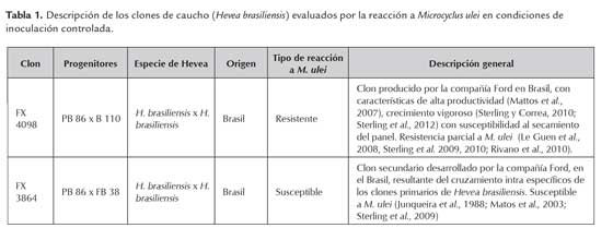 Se empleó el aislamiento CVI2 de M. ulei perteneciente al banco de aislamientos del Laboratorio de Fitopatología del Instituto Sinchi. Este aislamiento se obtuvo in vitro a partir de lesiones conidiales presentes en foliolos infectados en campo (vivero del género Hevea del Instituto Sinchi, Itarca, La Montañita, Colombia) y escogido por su virulencia (Sterling et al., 2011). El aislamiento fue conservado en medio de crecimiento (MC) (adaptado de Junqueira et al., 1984) en oscuridad a 24 °C y esporulado en medio M4 (papa dextrosa agar PDA) (adaptado de Mattos, 1999) con un fotoperíodo de 12 h. El inóculo primario, consistió de conidios crecidos in vitro los cuales se depositaron con un pincel pelo de marta (No. 2) en el envés de foliolos en estadio B2 (Halle et al., 1978) de plantas de un clon altamente susceptible (PB 260) (Sterling et al., 2009).