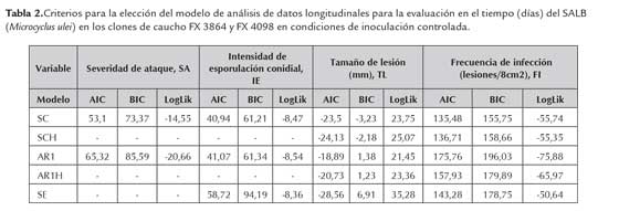 El modelo seleccionado en éste estudio para analizar la variación temporal del SALB en condiciones de inoculación controlada difiere del utilizado por Rivano et al. (2010) quienes reportaron un modelo autorre gresivo de primer orden con varianzas heterogéneas (AR1H) para la evaluación mensual de la susceptibilidad al SALB en condiciones de campo en Ecuador. En ambos estudios, los criterios AIC y BIC fueron los más importantes en la elección del modelo.