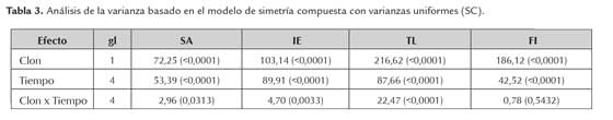 El análisis de las variables SA, IE, TL y FI se basó en un modelo de análisis de varianza de datos longitudinales (tablas 2, 3 y 4). El mejor modelo fue el de simetría compuesta con varianzas homogéneas (SC) (tabla 2). En general, para las variables evaluadas, los criterios (AIC y BIC) fueron mínimos para éste modelo, excepto para la variable TL en la cual el modelo SE presentó el menor valor para el criterio AIC (tabla 2). El modelo SC se utilizó para la inferencia estadística principalmente para analizar la significancia de la interacción Clon x Tiempo (tabla 3 y figuras 1A-D).
