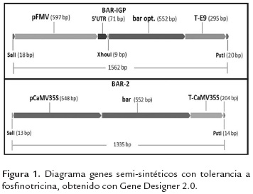 Herbicide tolerance is one of the features most used in GM crops, which has shown positive results for farmers and the environment. The starting point is the development of expression cassettes that express the characteristic of interest, they are initially constructed by standard molecular biology techniques. Currently, by bioinformatics and synthetic biology tools, it is possible to design and test the construct in silico, and then hire their synthesis. This approach allows optimizing expression by modifying the codon usage. In this work there were designed and evaluated semi-synthetic versions of genes in Nicotiana benthamiana, these genes confer tolerance to the herbicide phosphinothricin. It was made an analysis of freedom to operate in order to ensure that the designed constructs not violate intellectual property in Colombia. There were obtained two expression cassettes with freedom to operate, which express versions of the bar gene.
