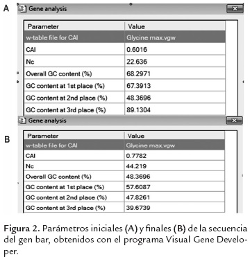 En este trabajo se diseñaron dos casetes de expresión (figura 1). En el primero, denominado Bar-IGP se realizaron modificaciones de uso codónico sobre la secuencia codificante original (gen bar de Streptomyces hygroscopicus), con el fin de acercarlo al uso codónico de la soya. Para este constructo se utilizó el promotor FMV y el terminador E9. Se eliminaron secuencias cripticas de splicing y sitios de poliadenilación prematuros del ORF. La secuencia del gen bar es de origen bacteriano, y tiene un alto contenido de GC en el tercer codón (89 %), que es un valor más alto que el reportado para genomas vegetales (Kawabe & Miyashita, 2003). Las modificaciones de uso codónico permitieron cambiar el contenido de GC a 40 %, que es un valor más cercano al observado en el genoma de la soya (45.69 %). Se cambiaron 153 pares de bases (27.72 %) y 132 codones (71.74 %). La figura 2 muestra una comparación de los parámetros mencionados entre la secuencia inicial y la secuencia final.