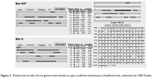 La herramienta ORF Finder demostró que los casetes de expresión generan una proteína de 183 aminoácidos (figura 3). Mediante alineamiento pareado con el algoritmo de Smith-Waterman se determinó un 100 % de identidad entre la proteína predicha y la proteína esperada, indicando que los constructos efectivamente codifican para la fosfinotricina acetil transferasa (P16426).