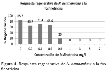 Nicotiana benthamiana se ha utilizado ampliamente como sistema modelo en diferentes áreas de la biología, puede ser transformada genéticamente y regenerada con buena eficiencia en tiempos cortos, en comparación con otras especies (Clemente, 2006; Goodin et al., 2008). Con el fin de determinar que los constructos diseñados efectivamente se expresan, se realizaron ensayos de transformación genética en dicha planta. Con el objetivo de usar la tolerancia a fosfinotricina como marcador de selección in vitro, se evaluó la respuesta regenerativa de N. benthamiana frente a este agente. Con todas las concentraciones menores a 1mg/l los explantes mostraron un aspecto muy semejante al tratamiento control. En los tratamientos 0.2, 0.4 y 0.6 mg/l se registró una leve disminución en su capacidad regenerativa, mientras que a 0.8 mg/l la regeneración cayó a 20% (figura 4). Según Lutz et al. (2001), los explantes de Nictiana tabacum cultivados sobre medio con concentraciones de PPT superiores a 4 mg/l se tornan blancos, para N. benthamiana este efecto se observó desde 1 mg/l. Se realizaron experimentos de transformación utilizando dos concentraciones 0.8 mg/l (concentración a la cual el explante conserva su capacidad regenerativa) y 3 mg/l (concentración letal).